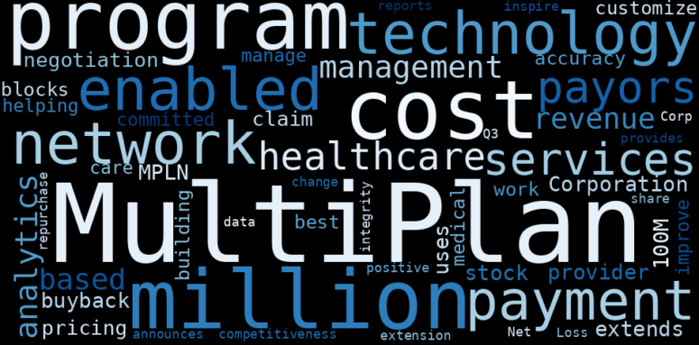 The game is changing. There is a new strategy to evaluate MultiPlan fundamental value, possible risks and most salient advantages. Investors have traditionally relied in reading large amounts of text to evaluate the fundamental value of a stock or company. However, the development of Artificial Intelligence (AI) tools is modifying the way investments are evaluated in markets. Today, machine learning, natural language processing and bigdata allow making this process automatic, reducing large amounts of text to the elements that have a higher activation in a neural network. We programmed an artificial intelligence that reads the whole internet and the uses natural language processing and vectorizers to summarize the information. Usually, the AI reads several hundred pages and summarize it to a short document. This document presents our results. We found that the most common words in the internet about MultiPlan are: MultiPlan, program, cost, technologyenabled, payment, service, payors, and the …