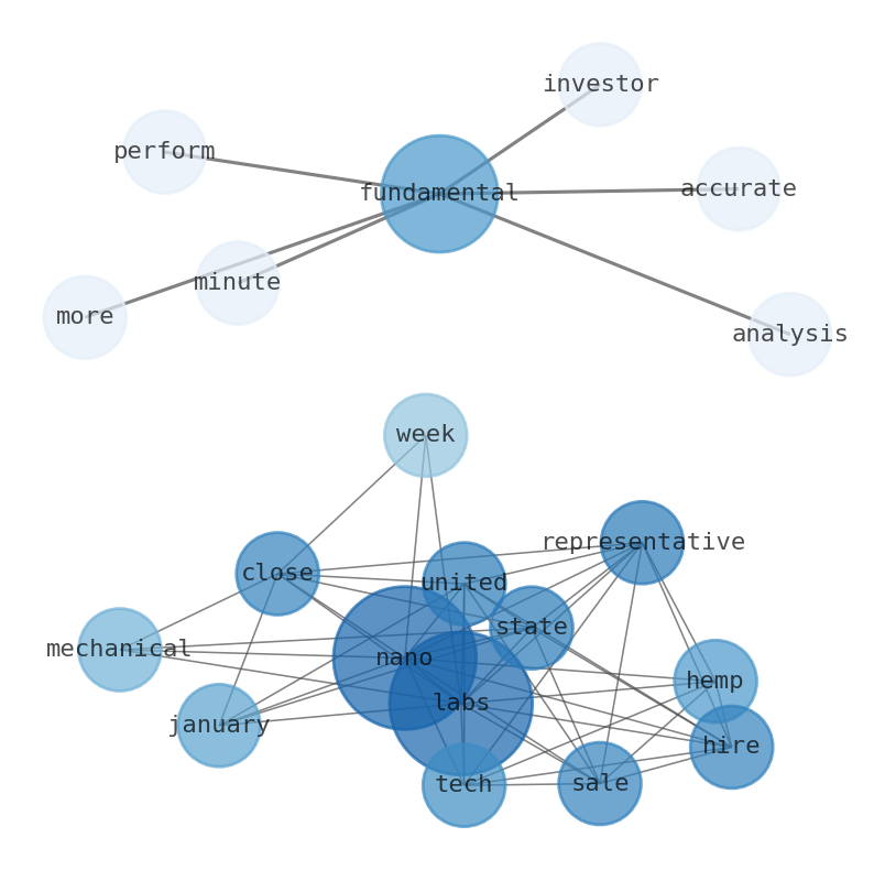 The game is changing. There is a new strategy to evaluate Nano Labs fundamental value, possible risks and most salient advantages. Investors have traditionally relied in reading large amounts of text to evaluate the fundamental value of a stock or company. However, the development of Artificial Intelligence (AI) tools is modifying the way investments are evaluated in markets. Today, machine learning, natural language processing and bigdata allow making this process automatic, reducing large amounts of text to the elements that have a higher activation in a neural network. We programmed an artificial intelligence that reads the whole internet and the uses natural language processing and vectorizers to summarize the information. Usually, the AI reads several hundred pages and summarize it to a short document. This document presents our results. We found that the most common words in the internet about Nano Labs are: Nano, Labs, fundamental, Hemp, Tech, hire, outside, …