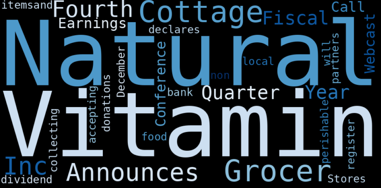 Are looking for the most relevant information about Natural Grocers by Vitamin Cottage? Investor spend a lot of time searching for information to make investment decisions in Natural Grocers by Vitamin Cottage. This task is often burdensome and consumes huge amounts of free time. It also leads to mistakes due to fatigue and bounded rationality. As a solution, we programmed an artificial intelligence that reads the whole internet and the uses natural language processing and vectorizers to summarize the information. Usually, the AI reads several hundred pages and summarize it to a short document. This document presents our results. We found that the most common words in the internet about Natural Grocers by Vitamin Cottage are: Natural, Vitamin, Cottage, Grocers, Inc, Announces, Fourth, and the most common words in the summary are: natural, grocer, item, add, vitamin, cottage, organic, . One of the sentences in the summary was: Cottage declares $0.10 dividend. Other searches related to this term that the AI found were: stockmarketlive, livestock, stockmarketforbeginners, thestockmarket, stockmarkettoday, stockmarkettrading, stockmarketstocks, todaystockmarket, thestockmarket, marketnews, stockmarketnews, whatisstockmarket, usstockmarket, stockmarketopen. #natural #grocer #item #add #vitamin #cottage #organic.