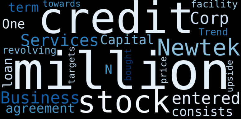 This document will help you to evaluate Newtek Business Services without reading an infinite amount of sources. Relying only on stock quotes or prices to make investment decisions is a mistake. Analyzing and observing stock charts, highs and lows and other numerical data does not allow to evaluate the real value of a company. Stock quotes and prices are the result of underlying characteristics of a company and of events and news happening around them. For this reason, investing must be based on information, not numbers. As a solution, we programmed an artificial intelligence that reads the whole internet and the uses natural language processing and vectorizers to summarize the information. Usually, the AI reads several hundred pages and summarize it to a short document. This document presents our results. We found that the most common words in the internet about Newtek Business Services are: credit, stock, Newtek, Business, Services, …