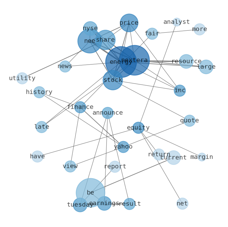 Are looking for the most relevant information about NextEra Energy? Investor spend a lot of time searching for information to make investment decisions in NextEra Energy. This task is often burdensome and consumes huge amounts of free time. It also leads to mistakes due to fatigue and bounded rationality. As a solution, we programmed an artificial intelligence that reads the whole internet and the uses natural language processing and vectorizers to summarize the information. Usually, the AI reads several hundred pages and summarize it to a short document. This document presents our results. We found that the most common words in the internet about NextEra Energy are: Energy, NextEra, stock, price, NEE, share, earnings, and the most common words in the summary are: energy, nextera, stock, job, market, best, nee, . One of the sentences in the summary was: The utility giant is set to give its latest quarterly earnings …