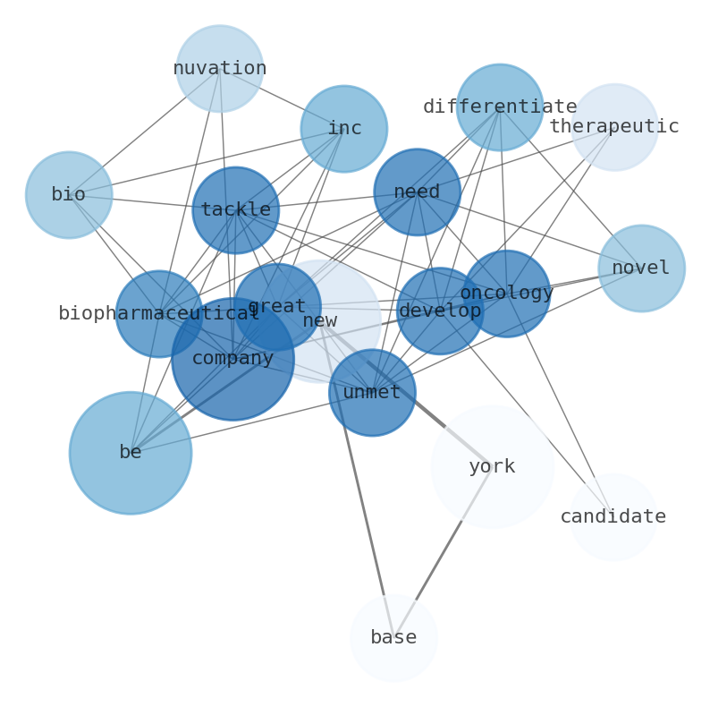 This document will help you to evaluate Nuvation Bio without reading an infinite amount of sources. Relying only on stock quotes or prices to make investment decisions is a mistake. Analyzing and observing stock charts, highs and lows and other numerical data does not allow to evaluate the real value of a company. Stock quotes and prices are the result of underlying characteristics of a company and of events and news happening around them. For this reason, investing must be based on information, not numbers. As a solution, we programmed an artificial intelligence that reads the whole internet and the uses natural language processing and vectorizers to summarize the information. Usually, the AI reads several hundred pages and summarize it to a short document. This document presents our results. We found that the most common words in the internet about Nuvation Bio are: company, New, York, Nuvation, Bio, Inc, biopharmaceutical, …