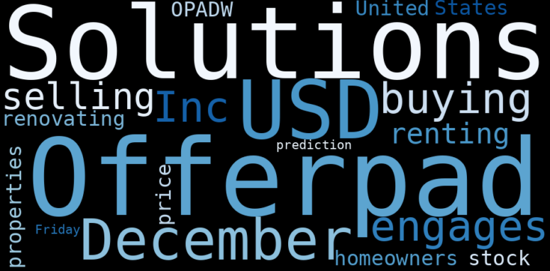 The game is changing. There is a new strategy to evaluate Offerpad Solutions fundamental value, possible risks and most salient advantages. Investors have traditionally relied in reading large amounts of text to evaluate the fundamental value of a stock or company. However, the development of Artificial Intelligence (AI) tools is modifying the way investments are evaluated in markets. Today, machine learning, natural language processing and bigdata allow making this process automatic, reducing large amounts of text to the elements that have a higher activation in a neural network. We programmed an artificial intelligence that reads the whole internet and the uses natural language processing and vectorizers to summarize the information. Usually, the AI reads several hundred pages and summarize it to a short document. This document presents our results. We found that the most common words in the internet about Offerpad Solutions are: Offerpad, USD, December, Solutions, Inc, engage, buy, …