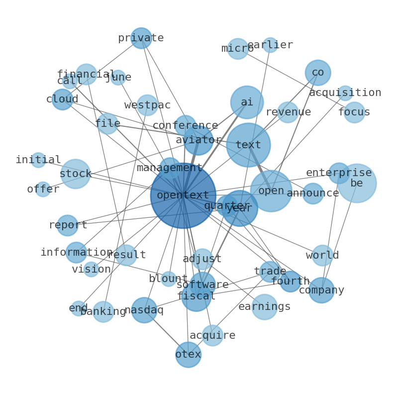 The game is changing. There is a new strategy to evaluate Open Text fundamental value, possible risks and most salient advantages. Investors have traditionally relied in reading large amounts of text to evaluate the fundamental value of a stock or company. However, the development of Artificial Intelligence (AI) tools is modifying the way investments are evaluated in markets. Today, machine learning, natural language processing and bigdata allow making this process automatic, reducing large amounts of text to the elements that have a higher activation in a neural network. We programmed an artificial intelligence that reads the whole internet and the uses natural language processing and vectorizers to summarize the information. Usually, the AI reads several hundred pages and summarize it to a short document. This document presents our results. We found that the most common words in the internet about Open Text are: OpenText, Text, Open, year, Aviator, company, software, …