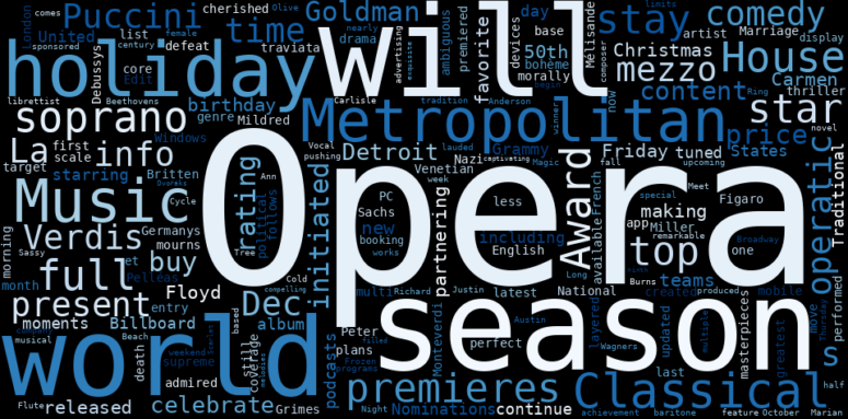 This document will help you to evaluate Opera without reading an infinite amount of sources. Relying only on stock quotes or prices to make investment decisions is a mistake. Analyzing and observing stock charts, highs and lows and other numerical data does not allow to evaluate the real value of a company. Stock quotes and prices are the result of underlying characteristics of a company and of events and news happening around them. For this reason, investing must be based on information, not numbers. As a solution, we programmed an artificial intelligence that reads the whole internet and the uses natural language processing and vectorizers to summarize the information. Usually, the AI reads several hundred pages and summarize it to a short document. This document presents our results. We found that the most common words in the internet about Opera are: Opera, opera, world, star, Metropolitan, season, holiday, and the …