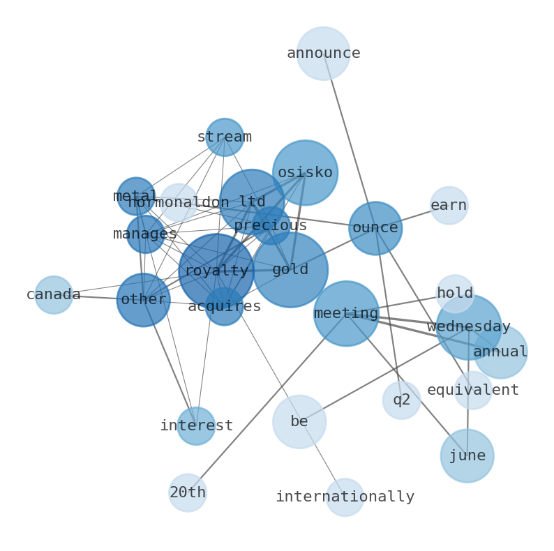 Are looking for the most relevant information about Osisko Gold Royalties? Investor spend a lot of time searching for information to make investment decisions in Osisko Gold Royalties. This task is often burdensome and consumes huge amounts of free time. It also leads to mistakes due to fatigue and bounded rationality. As a solution, we programmed an artificial intelligence that reads the whole internet and the uses natural language processing and vectorizers to summarize the information. Usually, the AI reads several hundred pages and summarize it to a short document. This document presents our results. We found that the most common words in the internet about Osisko Gold Royalties are: Osisko, Gold, Royalties, Ltd, Wednesday, announce, OR, and the most common words in the summary are: gold, news, corp, resource, ltd, project, inc, . One of the sentences in the summary was: Sell-side analysts anticipate that Osiskiros will post 0.5926487487487.. …