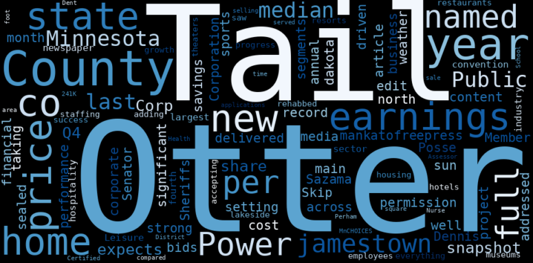Are looking for the most relevant information about Otter Tail? Investor spend a lot of time searching for information to make investment decisions in Otter Tail. This task is often burdensome and consumes huge amounts of free time. It also leads to mistakes due to fatigue and bounded rationality. As a solution, we programmed an artificial intelligence that reads the whole internet and the uses natural language processing and vectorizers to summarize the information. Usually, the AI reads several hundred pages and summarize it to a short document. This document presents our results. We found that the most common words in the internet about Otter Tail are: Otter, Tail, tail, earnings, state, County, price, and the most common words in the summary are: tail, otter, county, news, home, service, search, . One of the sentences in the summary was: Otter tail County home prices were up 25.5% compared to last …