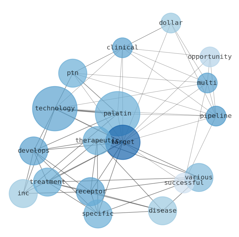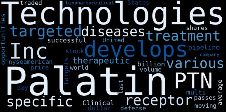 The game is changing. There is a new strategy to evaluate Palatin Technologies fundamental value, possible risks and most salient advantages. Investors have traditionally relied in reading large amounts of text to evaluate the fundamental value of a stock or company. However, the development of Artificial Intelligence (AI) tools is modifying the way investments are evaluated in markets. Today, machine learning, natural language processing and bigdata allow making this process automatic, reducing large amounts of text to the elements that have a higher activation in a neural network. We programmed an artificial intelligence that reads the whole internet and the uses natural language processing and vectorizers to summarize the information. Usually, the AI reads several hundred pages and summarize it to a short document. This document presents our results. We found that the most common words in the internet about Palatin Technologies are: Palatin, Technologies, target, technology, Inc, develop, therapeutic, …