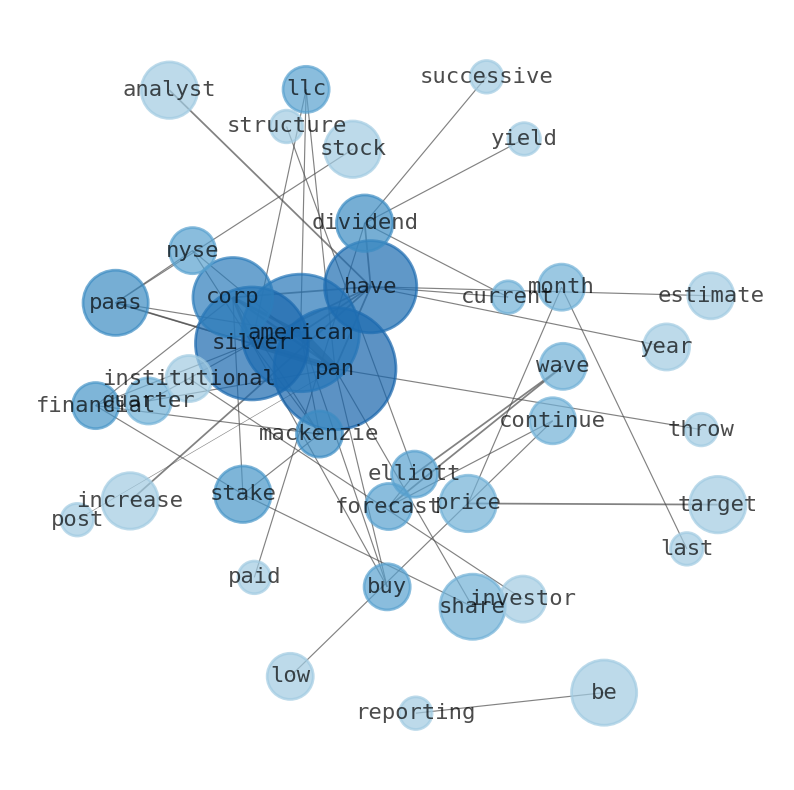 This document will help you to evaluate Pan American Silver without reading an infinite amount of sources. Relying only on stock quotes or prices to make investment decisions is a mistake. Analyzing and observing stock charts, highs and lows and other numerical data does not allow to evaluate the real value of a company. Stock quotes and prices are the result of underlying characteristics of a company and of events and news happening around them. For this reason, investing must be based on information, not numbers. As a solution, we programmed an artificial intelligence that reads the whole internet and the uses natural language processing and vectorizers to summarize the information. Usually, the AI reads several hundred pages and summarize it to a short document. This document presents our results. We found that the most common words in the internet about Pan American Silver are: Pan, American, Silver, Corp, share, …