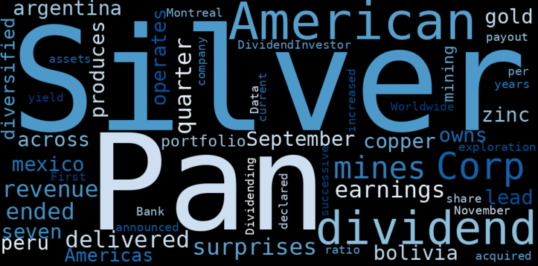How much time have you spent trying to decide whether investing in Pan American Silver? Many investors start with the dream of being free. They expect to find on the stock market an option to have time to develop their own interests and hobbies. That is, a way to escape a 9 to 5 job. However, investment is complex and investors end up spending whole days (and nights) trying to figure out which the right stock to invest is. The dream of stock investing becomes the nightmare of facing infinity amounts of information. As a solution, we programmed an artificial intelligence that reads the whole internet and the uses natural language processing and vectorizers to summarize the information. Usually, the AI reads several hundred pages and summarize it to a short document. This document presents our results. We found that the most common words in the internet about Pan American …