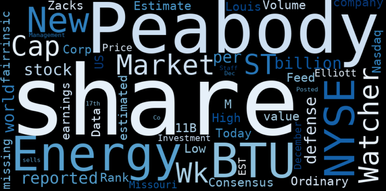 Are looking for the most relevant information about Peabody Energy? Investor spend a lot of time searching for information to make investment decisions in Peabody Energy. This task is often burdensome and consumes huge amounts of free time. It also leads to mistakes due to fatigue and bounded rationality. As a solution, we programmed an artificial intelligence that reads the whole internet and the uses natural language processing and vectorizers to summarize the information. Usually, the AI reads several hundred pages and summarize it to a short document. This document presents our results. We found that the most common words in the internet about Peabody Energy are: Peabody, Energy, share, New, BTU, report, Corp, and the most common words in the summary are: peabody, job, energy, stock, market, news, share, . One of the sentences in the summary was: Peabody Energy (BTU) reported earnings of $0.80 per share, missing the Zacks Consensus Estimate of $1.16 per share. Other searches related to this term that the AI found were: stockmarketlive, livestock, stockmarketforbeginners, thestockmarket, stockmarkettoday, stockmarkettrading, stockmarketstocks, todaystockmarket, thestockmarket, marketnews, stockmarketnews, whatisstockmarket, usstockmarket, stockmarketopen. #peabody #job #energy #stock #market #news #share.