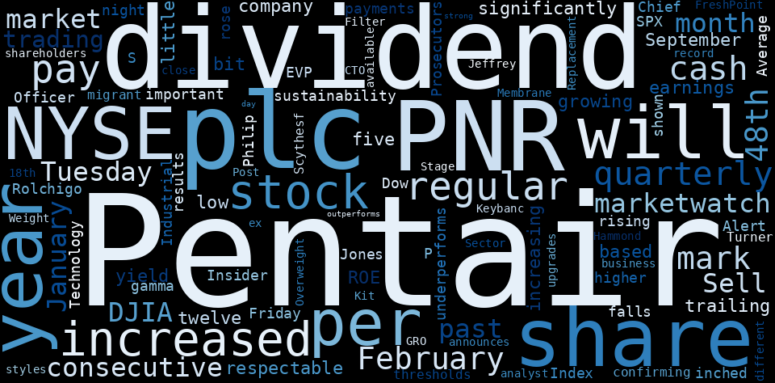 Are looking for the most relevant information about Pentair? Investor spend a lot of time searching for information to make investment decisions in Pentair. This task is often burdensome and consumes huge amounts of free time. It also leads to mistakes due to fatigue and bounded rationality. As a solution, we programmed an artificial intelligence that reads the whole internet and the uses natural language processing and vectorizers to summarize the information. Usually, the AI reads several hundred pages and summarize it to a short document. This document presents our results. We found that the most common words in the internet about Pentair are: Pentair, dividend, year, increase, plc, share, NYSEPNR, and the most common words in the summary are: go, back, pump, pool, water, pentair, filtration, . One of the sentences in the summary was: 2024 will mark the 48th consecutive year that Pentair has increased its dividend. Other …