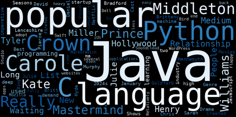 Julia (2022) 76% 8.3/10 tv-ma 2 Seasons Genre Drama Cast Sarah Lancashire, David Hyde Pierce, Brittany Bradford Created by Daniel Goldfarb. The Crown: Did Carole Middleton Really Mastermind Kate and Prince Williams Relationship? By Julie Miller Hollywood Medium Tyler Henry Has a Waiting List 600,000 People Long. The Crown: Did Carole Middleton Really Mastermind Kate and Prince Williams Relationship? By Julie Miller Hollywood Medium Tyler Henry Has a Waiting List 600,000 People Long By Britt Hennemuth New on Netflix: January 2024s Best New Movies & Shows By Chris Murphy. JavaScript and Python, two of the most popular languages in the startup industry, are in high demand. Java, C, C++, Java, and Python are some of the imperative programming languages. Python is a popular programming language for machine learning and deep learning applications. C# is used on the back end of several popular websites like Bing, Dell, Visual Studio, and MarketWatch. Java is less code-heavy than Java and other languages; Relatively easy to adopt Fully compatible with Java. Swift is used in popular iOS apps like WordPress, Mozilla Firefox, SoundCloud, and even in Flappy Bird.
