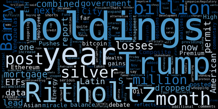 The commentary in this “post” reflects the personal opinions, viewpoints, and analyses of the Ritholtz Wealth Management employees providing such comments. The losses are becoming quite serious for “someone” since Nov 24 th , the accumulated losses by the silver shorts is a staggering $14. Since May, Fannie and Freddie have added more than $55 billion in mortgage principal balances to their combined holdings, an increase of more than 30%. Thats taken their combined mortgage holdings to a whopping $234 billion, the highest in four years. Analysts say their holdings could expand an additional $100 billion next year. Pension Fund Regulatory and Development Authority (PFRDA), will now permit gold, silver, and other commodities to diversify holdings. Major food companies are increasingly investing in or partnering with alternative protein ventures. Since the peak in the December 2023 quarter, holdings of Japanese government securities have dropped by ¥47.9 trillion (-8.1%) The BOJ stopped buying ETFs and J-REITs in Q4 2023. This is worse than the “plata o plomo” (silver or lead) deal Latin American drug cartels are famed for offering in their shakedowns of government officials. President Donald Trump said in a social-media post Friday that he would cap credit-card interest rates at 10% for the next year. Dealing with Trump is a difficult challenge for Delcy Rodriguez and other Latin American leaders, but they should all understand by now that caving to Trump or letting him pick them off one by one is a path to ruin. Barry Ritholtz: The gaslighting is off the charts,” dismissing all criticism as lies. Barry L. Ritholtz: GSEs ramp up debt-financed MBS purchases after years of running such holdings down. NAR report showed that median home sales in November was up just 12% from a year earlier. Barry L. Ritholtz: Why Trump wants Greenland and whats standing in his way. The data center rebellion is here, and its reshaping the political landscape. U.S. National, 10-City Composite, and 20-City. Composite Indices continued to report negative month-over-month changes in October. Noah Smith debates Brian Merchant on the robot future in a live debate. The Age of Twitter is finally ending. Recent AP-NORC poll shows poor numbers for Trump, including on economy and immigration. China is trying to kneecap Indian manufacturing. The Washington Post declared it would become “the most diverse and inclusive newsroom in the country’s. CNN pledged a “sustained commitment” to race coverage, while Bon Appétit confessed that “our mastheads have been far too white for far too long” Japan used the “ developmental state ” to great effect in its postwar miracle, and I believe this can help to produce another, smaller miracle today. On-chain data from CryptoQuant indicates that XRP holdings on Binance have dropped to 2.6 billion tokens, the lowest recorded balance since January 2024. Spot ETH ETFs posted roughly $200 million in net inflows. Metaplanet buys 4,279 bitcoin, lifts total holdings to 35,102 BTC. SharpLink Gaming deploys $170 million worth of ETH to Ethereum layer-2 scaling network Linea. Dogecoin, Bonk, Pepe, and ZCash, which posted double-digit gains in the first week, have followed top cryptos lead and tanked. Bitcoin and Ethereum consolidate after a strong start to 2026, while a select group of altcoins is posting significant weekly gains. Pushes Asian Premium to 8-Month High Venezuelas Oil in Floating Storage Soars to 29 Million Barrels. TotalEnergies Lands Key Offshore Exploration Permit in Lebanon. Andreessen Horowitz raised $15B. and international players such as Chevron, ExxonMobil, ConocoPhillips, Continental Resources, Halliburton, HKN Energy, Valero, Marathon, Shell, Trafigura, Vitol, Eni, Aspect Holdings, Tallgrass, Raisa Energy, and Hilcorp. Pushes Asian Premium to 8-Month High Venezuelas Oil in