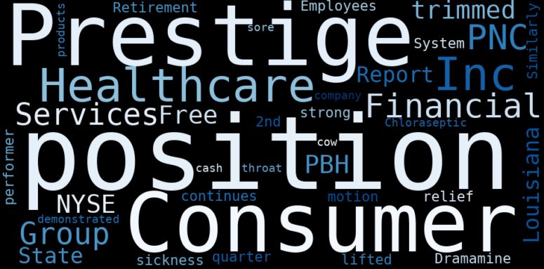 Are looking for the most relevant information about Prestige Consumer Healthcare? Investor spend a lot of time searching for information to make investment decisions in Prestige Consumer Healthcare. This task is often burdensome and consumes huge amounts of free time. It also leads to mistakes due to fatigue and bounded rationality. As a solution, we programmed an artificial intelligence that reads the whole internet and the uses natural language processing and vectorizers to summarize the information. Usually, the AI reads several hundred pages and summarize it to a short document. This document presents our results. We found that the most common words in the internet about Prestige Consumer Healthcare are: position, Prestige, Consumer, Healthcare, Inc, PNC, Financial, and the most common words in the summary are: consumer, healthcare, prestige, product, care, market, award, . One of the sentences in the summary was: (NYSE:PBH – Get Free Report ) Louisiana State …