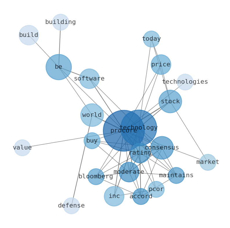 This document will help you to evaluate Procore Technologies without reading an infinite amount of sources. Relying only on stock quotes or prices to make investment decisions is a mistake. Analyzing and observing stock charts, highs and lows and other numerical data does not allow to evaluate the real value of a company. Stock quotes and prices are the result of underlying characteristics of a company and of events and news happening around them. For this reason, investing must be based on information, not numbers. As a solution, we programmed an artificial intelligence that reads the whole internet and the uses natural language processing and vectorizers to summarize the information. Usually, the AI reads several hundred pages and summarize it to a short document. This document presents our results. We found that the most common words in the internet about Procore Technologies are: Procore, Technologies, consensus, stock, rating, Moderate, software, …
