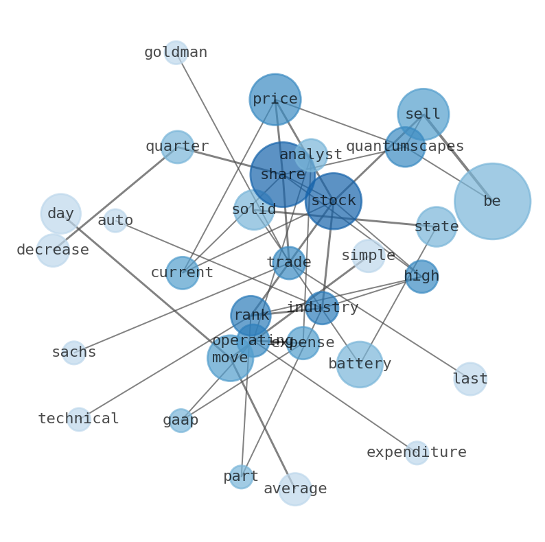 This document will help you to evaluate QuantumScape without reading an infinite amount of sources. Relying only on stock quotes or prices to make investment decisions is a mistake. Analyzing and observing stock charts, highs and lows and other numerical data does not allow to evaluate the real value of a company. Stock quotes and prices are the result of underlying characteristics of a company and of events and news happening around them. For this reason, investing must be based on information, not numbers. As a solution, we programmed an artificial intelligence that reads the whole internet and the uses natural language processing and vectorizers to summarize the information. Usually, the AI reads several hundred pages and summarize it to a short document. This document presents our results. We found that the most common words in the internet about QuantumScape are: QuantumScape, QS, share, stock, price, battery, Sell, and the …