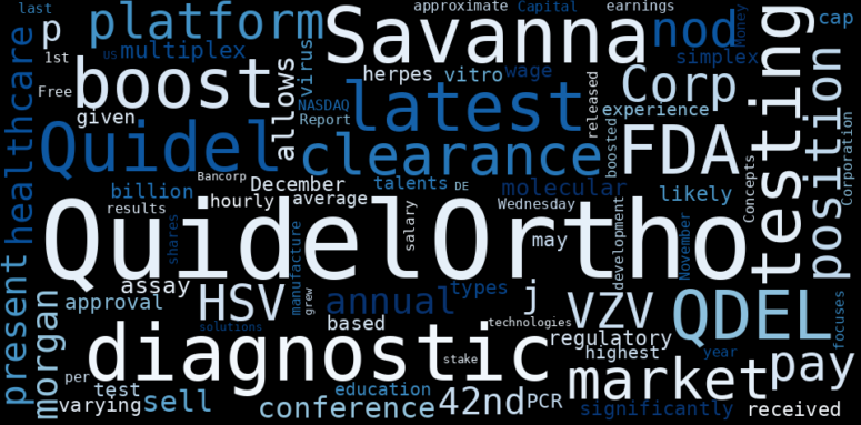 How much time have you spent trying to decide whether investing in QuidelOrtho? Many investors start with the dream of being free. They expect to find on the stock market an option to have time to develop their own interests and hobbies. That is, a way to escape a 9 to 5 job. However, investment is complex and investors end up spending whole days (and nights) trying to figure out which the right stock to invest is. The dream of stock investing becomes the nightmare of facing infinity amounts of information. As a solution, we programmed an artificial intelligence that reads the whole internet and the uses natural language processing and vectorizers to summarize the information. Usually, the AI reads several hundred pages and summarize it to a short document. This document presents our results. We found that the most common words in the internet about QuidelOrtho are: QuidelOrtho, Savanna, Quidelortho, boost, diagnostic, test, Quidel, and the most common words in the summary are: quidelortho, stock, market, november, december, price, news, . One of the sentences in the summary was: Quidelorthos (QDEL) Latest FDA Nod to Boost Diagnostic Testing. Other searches related to this term that the AI found were: stockmarketlive, livestock, stockmarketforbeginners, thestockmarket, stockmarkettoday, stockmarkettrading, stockmarketstocks, todaystockmarket, thestockmarket, marketnews, stockmarketnews, whatisstockmarket, usstockmarket, stockmarketopen. #quidelortho #stock #market #november #december #price #news.