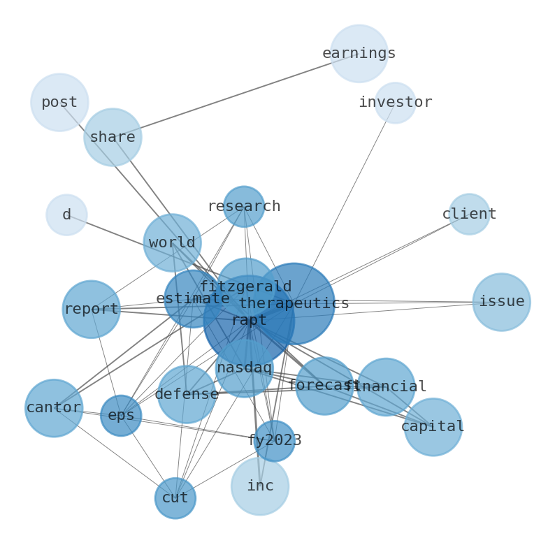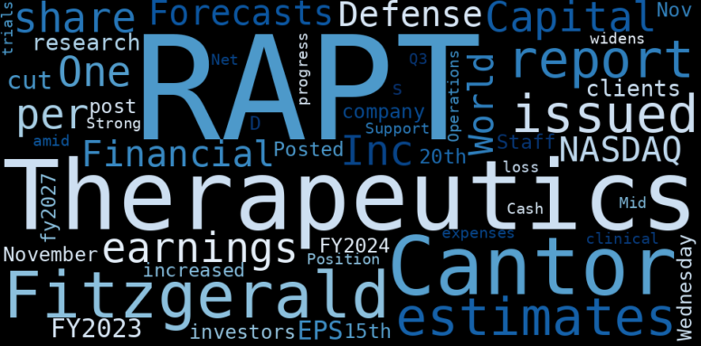 Are looking for the most relevant information about Rapt Therapeutics? Investor spend a lot of time searching for information to make investment decisions in Rapt Therapeutics. This task is often burdensome and consumes huge amounts of free time. It also leads to mistakes due to fatigue and bounded rationality. As a solution, we programmed an artificial intelligence that reads the whole internet and the uses natural language processing and vectorizers to summarize the information. Usually, the AI reads several hundred pages and summarize it to a short document. This document presents our results. We found that the most common words in the internet about Rapt Therapeutics are: RAPT, Therapeutics, Cantor, Fitzgerald, estimate, report, issue, and the most common words in the summary are: inc, therapeutic, corp, group, holding, ltd, technology, . One of the sentences in the summary was: Cantor Fitzgerald also issued estimates for the company’s FY2024 earnings at …