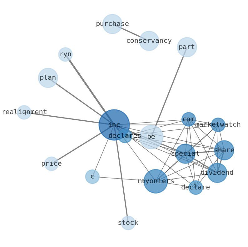 Are looking for the most relevant information about Rayonier? Investor spend a lot of time searching for information to make investment decisions in Rayonier. This task is often burdensome and consumes huge amounts of free time. It also leads to mistakes due to fatigue and bounded rationality. As a solution, we programmed an artificial intelligence that reads the whole internet and the uses natural language processing and vectorizers to summarize the information. Usually, the AI reads several hundred pages and summarize it to a short document. This document presents our results. We found that the most common words in the internet about Rayonier are: Rayonier, Inc, Rayoniers, declare, special, dividend, share, and the most common words in the summary are: rayonier, dividend, stock, inc, ryn, price, share, . One of the sentences in the summary was: Nature Conservancy has purchased 3,184 acres along the Hoh River near the Washington coast.. Other searches related to this term that the AI found were: stockmarketlive, livestock, stockmarketforbeginners, thestockmarket, stockmarkettoday, stockmarkettrading, stockmarketstocks, todaystockmarket, thestockmarket, marketnews, stockmarketnews, whatisstockmarket, usstockmarket, stockmarketopen. #rayonier #dividend #stock #inc #ryn #price #share.