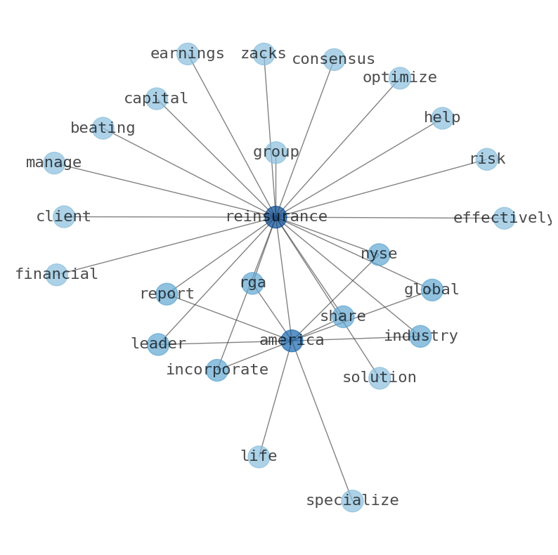 This document will help you to evaluate Reinsurance Group of America without reading an infinite amount of sources. Relying only on stock quotes or prices to make investment decisions is a mistake. Analyzing and observing stock charts, highs and lows and other numerical data does not allow to evaluate the real value of a company. Stock quotes and prices are the result of underlying characteristics of a company and of events and news happening around them. For this reason, investing must be based on information, not numbers. As a solution, we programmed an artificial intelligence that reads the whole internet and the uses natural language processing and vectorizers to summarize the information. Usually, the AI reads several hundred pages and summarize it to a short document. This document presents our results. We found that the most common words in the internet about Reinsurance Group of America are: Group, America, Reinsurance, …