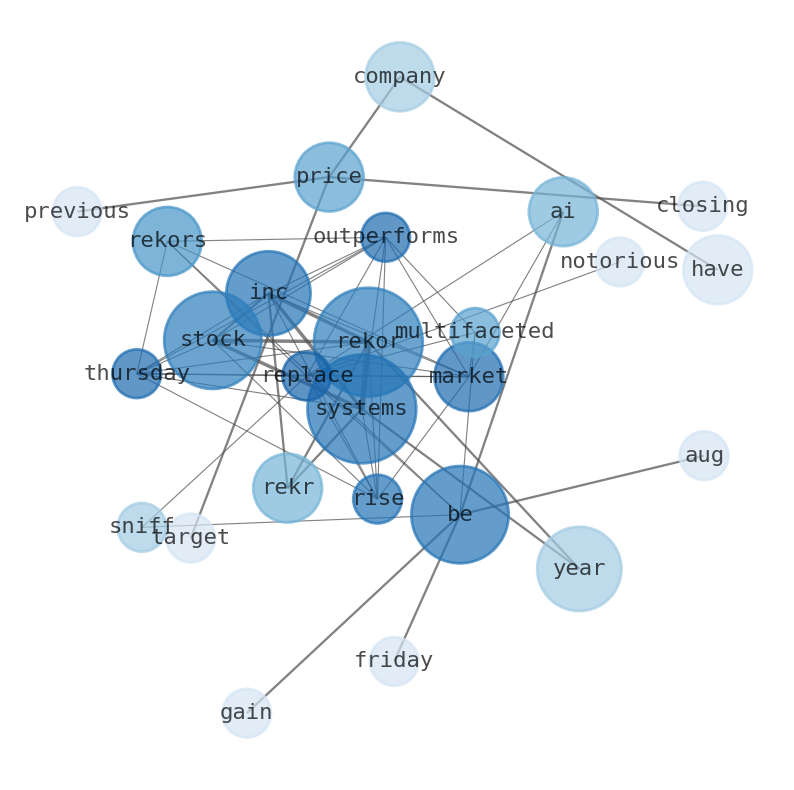 Are looking for the most relevant information about Rekor Systems? Investor spend a lot of time searching for information to make investment decisions in Rekor Systems. This task is often burdensome and consumes huge amounts of free time. It also leads to mistakes due to fatigue and bounded rationality. As a solution, we programmed an artificial intelligence that reads the whole internet and the uses natural language processing and vectorizers to summarize the information. Usually, the AI reads several hundred pages and summarize it to a short document. This document presents our results. We found that the most common words in the internet about Rekor Systems are: Systems, Rekor, Inc, stock, market, Rekors, AI, and the most common words in the summary are: system, rekor, stock, inc, market, follow, news, . One of the sentences in the summary was: (REKR) CEO Robert Alan Berman recently purchased 25,000 shares of RekOr …