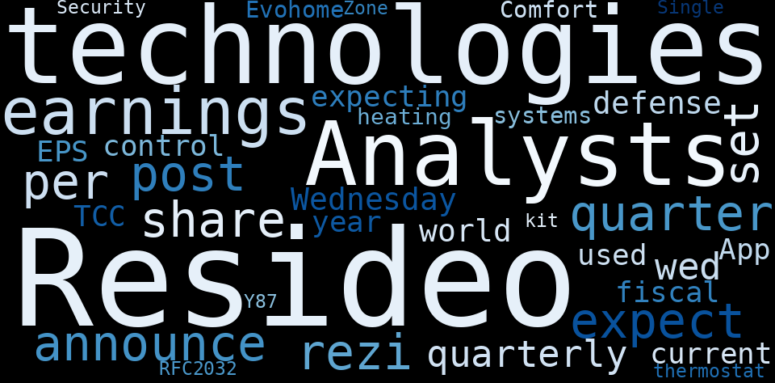 The game is changing. There is a new strategy to evaluate Resideo Technologies fundamental value, possible risks and most salient advantages. Investors have traditionally relied in reading large amounts of text to evaluate the fundamental value of a stock or company. However, the development of Artificial Intelligence (AI) tools is modifying the way investments are evaluated in markets. Today, machine learning, natural language processing and bigdata allow making this process automatic, reducing large amounts of text to the elements that have a higher activation in a neural network. We programmed an artificial intelligence that reads the whole internet and the uses natural language processing and vectorizers to summarize the information. Usually, the AI reads several hundred pages and summarize it to a short document. This document presents our results. We found that the most common words in the internet about Resideo Technologies are: Analysts, expect, Resideo, earnings, technology, Technologies, post, …