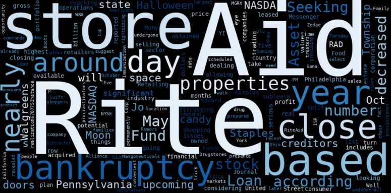 Are looking for the most relevant information about Rite Aid? Investor spend a lot of time searching for information to make investment decisions in Rite Aid. This task is often burdensome and consumes huge amounts of free time. It also leads to mistakes due to fatigue and bounded rationality. As a solution, we programmed an artificial intelligence that reads the whole internet and the uses natural language processing and vectorizers to summarize the information. Usually, the AI reads several hundred pages and summarize it to a short document. This document presents our results. We found that the most common words in the internet about Rite Aid are: Rite, Aid, store, Aids, close, year, nearly, and the most common words in the summary are: rite, aid, job, stock, store, pharmacy, business, . One of the sentences in the summary was: Rite Aid seeking asset-based loan to fund itself in bankruptcy. Other …