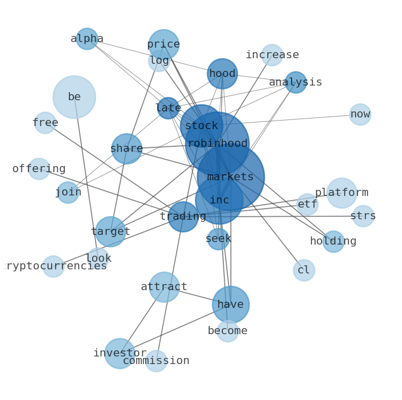 This document will help you to evaluate Robinhood Markets without reading an infinite amount of sources. Relying only on stock quotes or prices to make investment decisions is a mistake. Analyzing and observing stock charts, highs and lows and other numerical data does not allow to evaluate the real value of a company. Stock quotes and prices are the result of underlying characteristics of a company and of events and news happening around them. For this reason, investing must be based on information, not numbers. As a solution, we programmed an artificial intelligence that reads the whole internet and the uses natural language processing and vectorizers to summarize the information. Usually, the AI reads several hundred pages and summarize it to a short document. This document presents our results. We found that the most common words in the internet about Robinhood Markets are: Robinhood, Markets, Inc, market, stock, company, HOOD, …