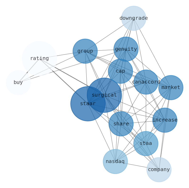 The game is changing. There is a new strategy to evaluate STAAR Surgical Company fundamental value, possible risks and most salient advantages. Investors have traditionally relied in reading large amounts of text to evaluate the fundamental value of a stock or company. However, the development of Artificial Intelligence (AI) tools is modifying the way investments are evaluated in markets. Today, machine learning, natural language processing and bigdata allow making this process automatic, reducing large amounts of text to the elements that have a higher activation in a neural network. We programmed an artificial intelligence that reads the whole internet and the uses natural language processing and vectorizers to summarize the information. Usually, the AI reads several hundred pages and summarize it to a short document. This document presents our results. We found that the most common words in the internet about STAAR Surgical Company are: Surgical, rating, STAAR, Company, Nasdaq, …