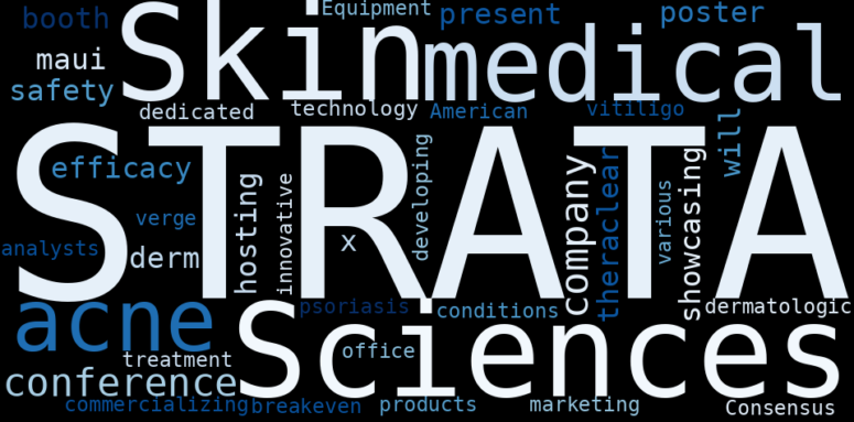 This document will help you to evaluate STRATA Skin Sciences without reading an infinite amount of sources. Relying only on stock quotes or prices to make investment decisions is a mistake. Analyzing and observing stock charts, highs and lows and other numerical data does not allow to evaluate the real value of a company. Stock quotes and prices are the result of underlying characteristics of a company and of events and news happening around them. For this reason, investing must be based on information, not numbers. As a solution, we programmed an artificial intelligence that reads the whole internet and the uses natural language processing and vectorizers to summarize the information. Usually, the AI reads several hundred pages and summarize it to a short document. This document presents our results. We found that the most common words in the internet about STRATA Skin Sciences are: STRATA, Sciences, Skin, acne, conference, …
