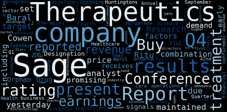 The game is changing. There is a new strategy to evaluate Sage Therapeutics fundamental value, possible risks and most salient advantages. Investors have traditionally relied in reading large amounts of text to evaluate the fundamental value of a stock or company. However, the development of Artificial Intelligence (AI) tools is modifying the way investments are evaluated in markets. Today, machine learning, natural language processing and bigdata allow making this process automatic, reducing large amounts of text to the elements that have a higher activation in a neural network. We programmed an artificial intelligence that reads the whole internet and the uses natural language processing and vectorizers to summarize the information. Usually, the AI reads several hundred pages and summarize it to a short document. This document presents our results. We found that the most common words in the internet about Sage Therapeutics are: Therapeutics, Sage, company, SAGE, report, Q4, Buy, …
