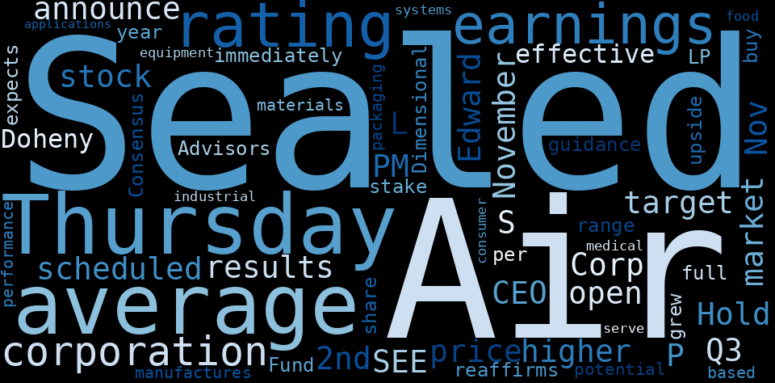 How much time have you spent trying to decide whether investing in Sealed Air? Many investors start with the dream of being free. They expect to find on the stock market an option to have time to develop their own interests and hobbies. That is, a way to escape a 9 to 5 job. However, investment is complex and investors end up spending whole days (and nights) trying to figure out which the right stock to invest is. The dream of stock investing becomes the nightmare of facing infinity amounts of information. As a solution, we programmed an artificial intelligence that reads the whole internet and the uses natural language processing and vectorizers to summarize the information. Usually, the AI reads several hundred pages and summarize it to a short document. This document presents our results. We found that the most common words in the internet about Sealed Air are: Sealed, Air, Thursday, air, average, rating, earnings, and the most common words in the summary are: air, seal, station, new, market, quality, see, . One of the sentences in the summary was: CEO Edward L. Other searches related to this term that the AI found were: stockmarketlive, livestock, stockmarketforbeginners, thestockmarket, stockmarkettoday, stockmarkettrading, stockmarketstocks, todaystockmarket, thestockmarket, marketnews, stockmarketnews, whatisstockmarket, usstockmarket, stockmarketopen. #air #seal #station #new #market #quality #see.