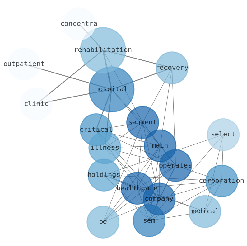 This document will help you to evaluate Select Medical Holdings without reading an infinite amount of sources. Relying only on stock quotes or prices to make investment decisions is a mistake. Analyzing and observing stock charts, highs and lows and other numerical data does not allow to evaluate the real value of a company. Stock quotes and prices are the result of underlying characteristics of a company and of events and news happening around them. For this reason, investing must be based on information, not numbers. As a solution, we programmed an artificial intelligence that reads the whole internet and the uses natural language processing and vectorizers to summarize the information. Usually, the AI reads several hundred pages and summarize it to a short document. This document presents our results. We found that the most common words in the internet about Select Medical Holdings are: hospital, rehabilitation, Select, Medical, Holdings, …
