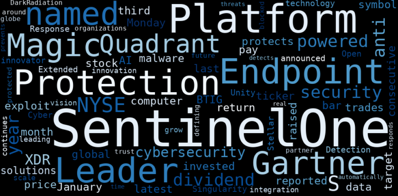 How much time have you spent trying to decide whether investing in SentinelOne? Many investors start with the dream of being free. They expect to find on the stock market an option to have time to develop their own interests and hobbies. That is, a way to escape a 9 to 5 job. However, investment is complex and investors end up spending whole days (and nights) trying to figure out which the right stock to invest is. The dream of stock investing becomes the nightmare of facing infinity amounts of information. As a solution, we programmed an artificial intelligence that reads the whole internet and the uses natural language processing and vectorizers to summarize the information. Usually, the AI reads several hundred pages and summarize it to a short document. This document presents our results. We found that the most common words in the internet about SentinelOne are: SentinelOne, name, …