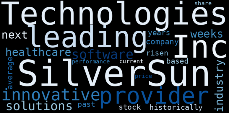 How much time have you spent trying to decide whether investing in SilverSun Technologies? Many investors start with the dream of being free. They expect to find on the stock market an option to have time to develop their own interests and hobbies. That is, a way to escape a 9 to 5 job. However, investment is complex and investors end up spending whole days (and nights) trying to figure out which the right stock to invest is. The dream of stock investing becomes the nightmare of facing infinity amounts of information. As a solution, we programmed an artificial intelligence that reads the whole internet and the uses natural language processing and vectorizers to summarize the information. Usually, the AI reads several hundred pages and summarize it to a short document. This document presents our results. We found that the most common words in the internet about SilverSun Technologies are: …