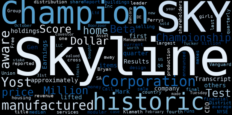 The game is changing. There is a new strategy to evaluate Skyline Champion fundamental value, possible risks and most salient advantages. Investors have traditionally relied in reading large amounts of text to evaluate the fundamental value of a stock or company. However, the development of Artificial Intelligence (AI) tools is modifying the way investments are evaluated in markets. Today, machine learning, natural language processing and bigdata allow making this process automatic, reducing large amounts of text to the elements that have a higher activation in a neural network. We programmed an artificial intelligence that reads the whole internet and the uses natural language processing and vectorizers to summarize the information. Usually, the AI reads several hundred pages and summarize it to a short document. This document presents our results. We found that the most common words in the internet about Skyline Champion are: Skyline, Champion, SKY, historic, Corporation, manufacture, Yost, …