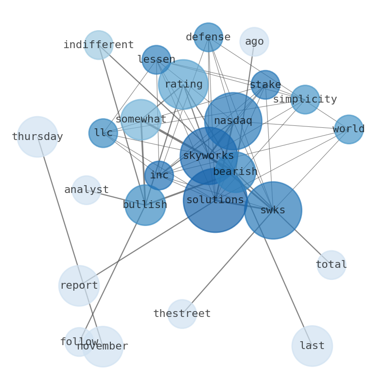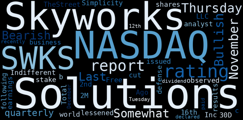 Are looking for the most relevant information about Skyworks Solutions? Investor spend a lot of time searching for information to make investment decisions in Skyworks Solutions. This task is often burdensome and consumes huge amounts of free time. It also leads to mistakes due to fatigue and bounded rationality. As a solution, we programmed an artificial intelligence that reads the whole internet and the uses natural language processing and vectorizers to summarize the information. Usually, the AI reads several hundred pages and summarize it to a short document. This document presents our results. We found that the most common words in the internet about Skyworks Solutions are: Solutions, Skyworks, NASDAQSWKS, rating, Thursday, November, Bullish, and the most common words in the summary are: solution, skyworks, job, best, stock, inc, irvine, . One of the sentences in the summary was: Solutions.. Other searches related to this term that the AI found …