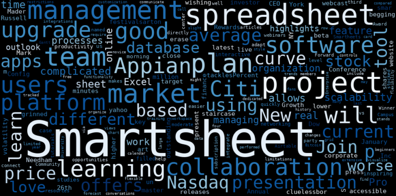 Are looking for the most relevant information about Smartsheet? Investor spend a lot of time searching for information to make investment decisions in Smartsheet. This task is often burdensome and consumes huge amounts of free time. It also leads to mistakes due to fatigue and bounded rationality. As a solution, we programmed an artificial intelligence that reads the whole internet and the uses natural language processing and vectorizers to summarize the information. Usually, the AI reads several hundred pages and summarize it to a short document. This document presents our results. We found that the most common words in the internet about Smartsheet are: Smartsheet, Smartsheets, learn, project, market, team, management, and the most common words in the summary are: smartsheet, plan, management, job, stock, review, project, . One of the sentences in the summary was: A live webcast of the presentation will be accessible on Smartheets investor website: http://www.smartsheet.com.. …