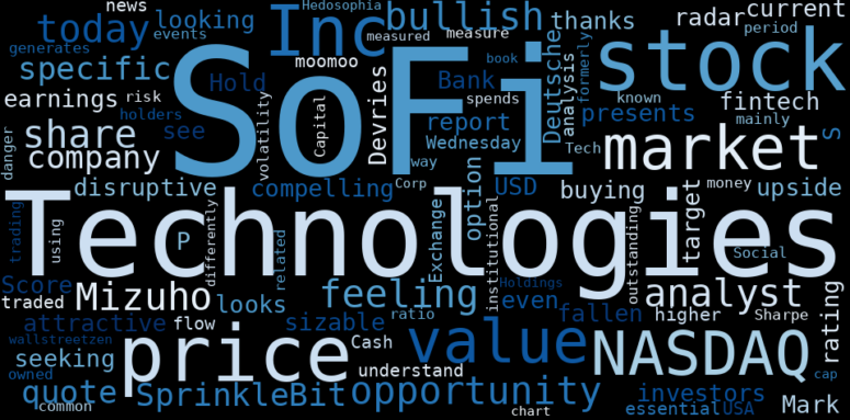 This document will help you to evaluate SoFi Technologies without reading an infinite amount of sources. Relying only on stock quotes or prices to make investment decisions is a mistake. Analyzing and observing stock charts, highs and lows and other numerical data does not allow to evaluate the real value of a company. Stock quotes and prices are the result of underlying characteristics of a company and of events and news happening around them. For this reason, investing must be based on information, not numbers. As a solution, we programmed an artificial intelligence that reads the whole internet and the uses natural language processing and vectorizers to summarize the information. Usually, the AI reads several hundred pages and summarize it to a short document. This document presents our results. We found that the most common words in the internet about SoFi Technologies are: SoFi, Technologies, SOFI, stock, price, sofi, Inc, and the most common words in the summary are: sofi, stock, technology, market, price, top, option, . One of the sentences in the summary was: Mizuho analysts are feeling even more bullish on SoFi Technologies after its earnings report. Other searches related to this term that the AI found were: stockmarketlive, livestock, stockmarketforbeginners, thestockmarket, stockmarkettoday, stockmarkettrading, stockmarketstocks, todaystockmarket, thestockmarket, marketnews, stockmarketnews, whatisstockmarket, usstockmarket, stockmarketopen. #sofi #stock #technology #market #price #top #option.