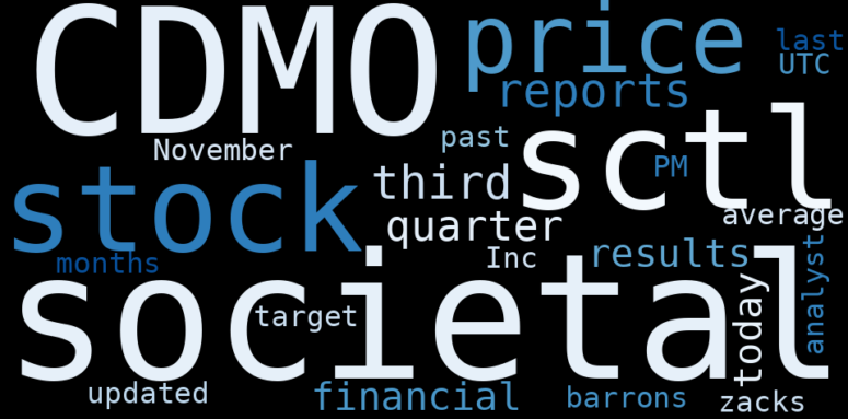Are looking for the most relevant information about Societal CDMO? Investor spend a lot of time searching for information to make investment decisions in Societal CDMO. This task is often burdensome and consumes huge amounts of free time. It also leads to mistakes due to fatigue and bounded rationality. As a solution, we programmed an artificial intelligence that reads the whole internet and the uses natural language processing and vectorizers to summarize the information. Usually, the AI reads several hundred pages and summarize it to a short document. This document presents our results. We found that the most common words in the internet about Societal CDMO are: CDMO, societal, Societal, report, third, quarter, financial, and the most common words in the summary are: inc, corp, group, holding, ltd, income, technology, . One of the sentences in the summary was: The SCTL average analyst price target in the past 3 months …