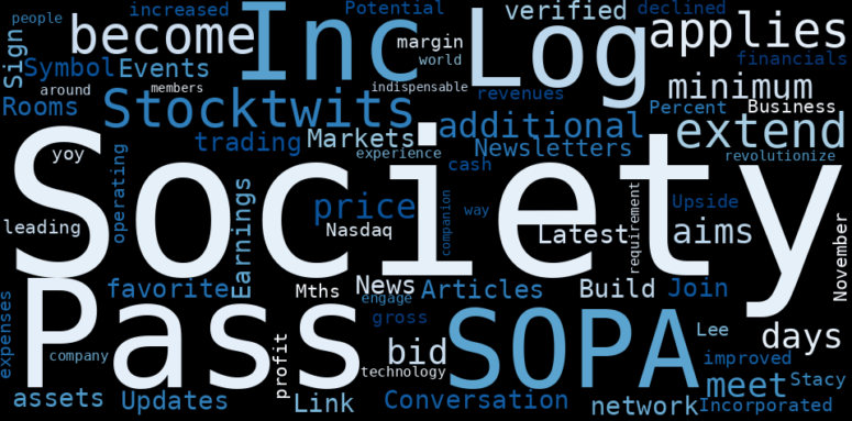 Are looking for the most relevant information about Society Pass? Investor spend a lot of time searching for information to make investment decisions in Society Pass. This task is often burdensome and consumes huge amounts of free time. It also leads to mistakes due to fatigue and bounded rationality. As a solution, we programmed an artificial intelligence that reads the whole internet and the uses natural language processing and vectorizers to summarize the information. Usually, the AI reads several hundred pages and summarize it to a short document. This document presents our results. We found that the most common words in the internet about Society Pass are: Society, Pass, Inc, SOPA, Log, become, apply, and the most common words in the summary are: society, pas, news, program, event, open, best, . One of the sentences in the summary was: Society Pass Incorporated (Nasdaq: SOPA) applies to extend an additional 180 days to meet minimum bid price. Other searches related to this term that the AI found were: stockmarketlive, livestock, stockmarketforbeginners, thestockmarket, stockmarkettoday, stockmarkettrading, stockmarketstocks, todaystockmarket, thestockmarket, marketnews, stockmarketnews, whatisstockmarket, usstockmarket, stockmarketopen. #society #pas #news #program #event #open #best.