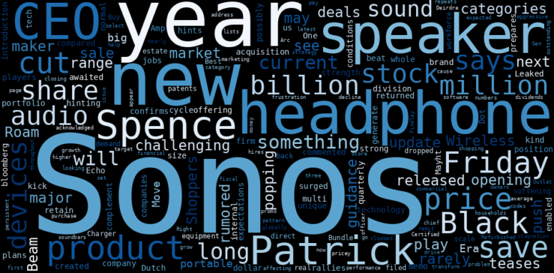 How much time have you spent trying to decide whether investing in Sonos? Many investors start with the dream of being free. They expect to find on the stock market an option to have time to develop their own interests and hobbies. That is, a way to escape a 9 to 5 job. However, investment is complex and investors end up spending whole days (and nights) trying to figure out which the right stock to invest is. The dream of stock investing becomes the nightmare of facing infinity amounts of information. As a solution, we programmed an artificial intelligence that reads the whole internet and the uses natural language processing and vectorizers to summarize the information. Usually, the AI reads several hundred pages and summarize it to a short document. This document presents our results. We found that the most common words in the internet about Sonos are: Sonos, headphone, …