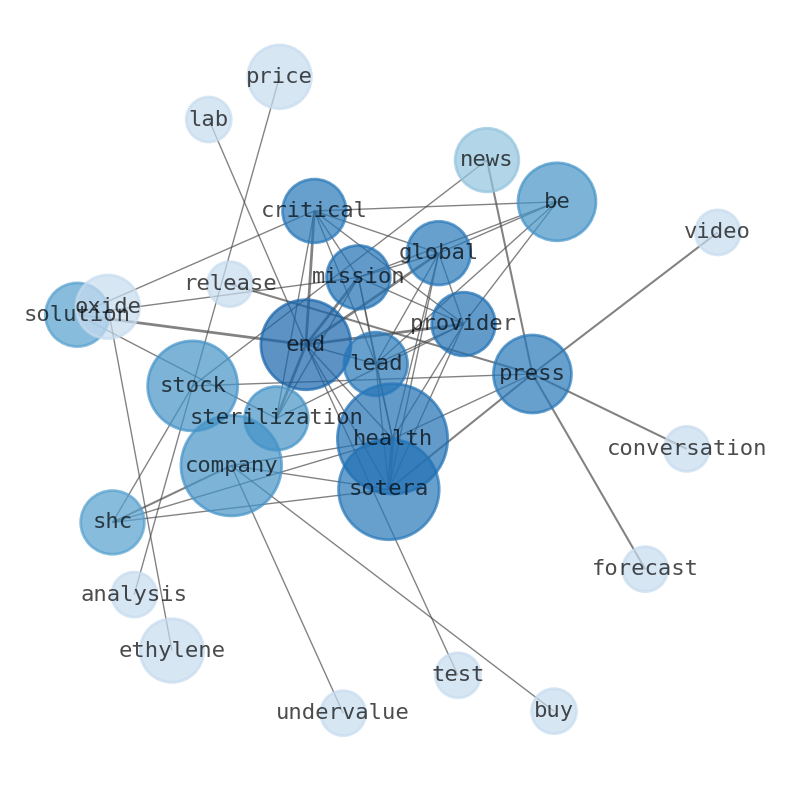This document will help you to evaluate Sotera Health Company without reading an infinite amount of sources. Relying only on stock quotes or prices to make investment decisions is a mistake. Analyzing and observing stock charts, highs and lows and other numerical data does not allow to evaluate the real value of a company. Stock quotes and prices are the result of underlying characteristics of a company and of events and news happening around them. For this reason, investing must be based on information, not numbers. As a solution, we programmed an artificial intelligence that reads the whole internet and the uses natural language processing and vectorizers to summarize the information. Usually, the AI reads several hundred pages and summarize it to a short document. This document presents our results. We found that the most common words in the internet about Sotera Health Company are: Sotera, Health, stock, Press, health, …