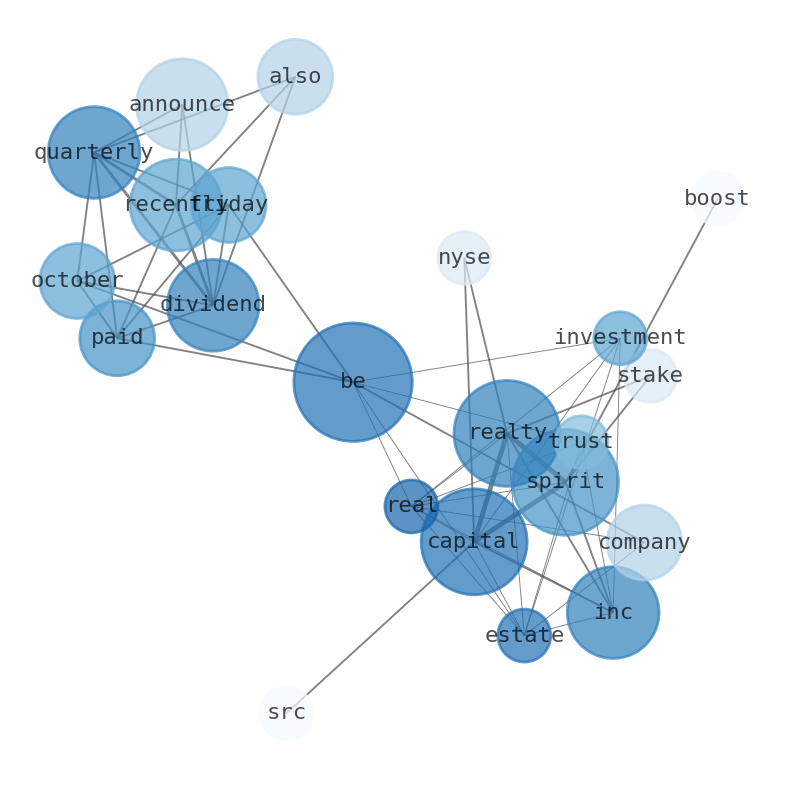 How much time have you spent trying to decide whether investing in Spirit Realty Capital? Many investors start with the dream of being free. They expect to find on the stock market an option to have time to develop their own interests and hobbies. That is, a way to escape a 9 to 5 job. However, investment is complex and investors end up spending whole days (and nights) trying to figure out which the right stock to invest is. The dream of stock investing becomes the nightmare of facing infinity amounts of information. As a solution, we programmed an artificial intelligence that reads the whole internet and the uses natural language processing and vectorizers to summarize the information. Usually, the AI reads several hundred pages and summarize it to a short document. This document presents our results. We found that the most common words in the internet about Spirit Realty Capital are: Spirit, Capital, Realty, Inc, recently, announce, quarterly, and the most common words in the summary are: report, capital, realty, market, spirit, inc, reit, . One of the sentences in the summary was: Firm also recently disclosed a quarterly. Other searches related to this term that the AI found were: stockmarketlive, livestock, stockmarketforbeginners, thestockmarket, stockmarkettoday, stockmarkettrading, stockmarketstocks, todaystockmarket, thestockmarket, marketnews, stockmarketnews, whatisstockmarket, usstockmarket, stockmarketopen. #report #capital #realty #market #spirit #inc #reit.