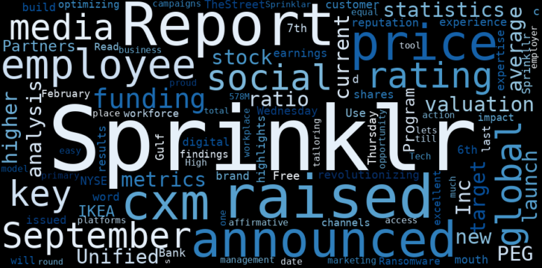 How much time have you spent trying to decide whether investing in Sprinklr? Many investors start with the dream of being free. They expect to find on the stock market an option to have time to develop their own interests and hobbies. That is, a way to escape a 9 to 5 job. However, investment is complex and investors end up spending whole days (and nights) trying to figure out which the right stock to invest is. The dream of stock investing becomes the nightmare of facing infinity amounts of information. As a solution, we programmed an artificial intelligence that reads the whole internet and the uses natural language processing and vectorizers to summarize the information. Usually, the AI reads several hundred pages and summarize it to a short document. This document presents our results. We found that the most common words in the internet about Sprinklr are: Sprinklr, Sprinklrs, …