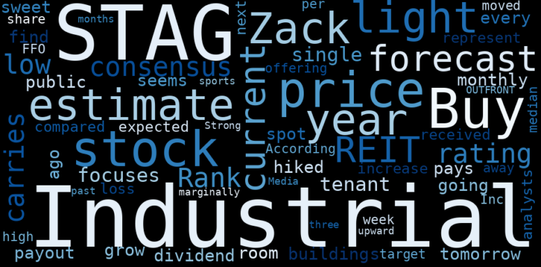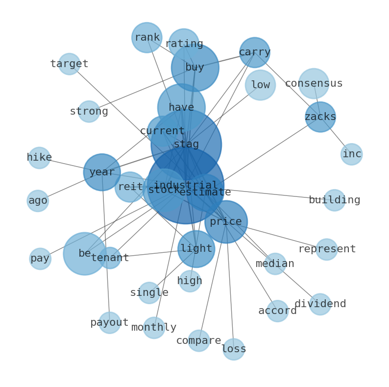 This document will help you to evaluate Stag Industrial without reading an infinite amount of sources. Relying only on stock quotes or prices to make investment decisions is a mistake. Analyzing and observing stock charts, highs and lows and other numerical data does not allow to evaluate the real value of a company. Stock quotes and prices are the result of underlying characteristics of a company and of events and news happening around them. For this reason, investing must be based on information, not numbers. As a solution, we programmed an artificial intelligence that reads the whole internet and the uses natural language processing and vectorizers to summarize the information. Usually, the AI reads several hundred pages and summarize it to a short document. This document presents our results. We found that the most common words in the internet about Stag Industrial are: Industrial, STAG, Stag, stock, price, Buy, industrial, …
