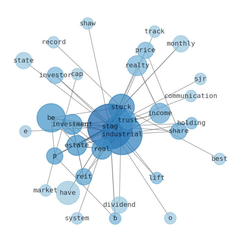 This document will help you to evaluate Stag Industrial without reading an infinite amount of sources. Relying only on stock quotes or prices to make investment decisions is a mistake. Analyzing and observing stock charts, highs and lows and other numerical data does not allow to evaluate the real value of a company. Stock quotes and prices are the result of underlying characteristics of a company and of events and news happening around them. For this reason, investing must be based on information, not numbers. As a solution, we programmed an artificial intelligence that reads the whole internet and the uses natural language processing and vectorizers to summarize the information. Usually, the AI reads several hundred pages and summarize it to a short document. This document presents our results. We found that the most common words in the internet about Stag Industrial are: STAG, Industrial, industrial, stock, Stag, real, estate, …