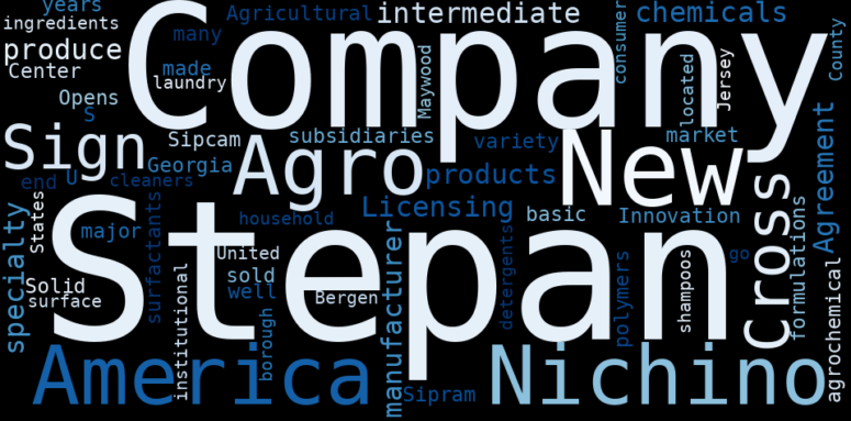 This document will help you to evaluate Stepan Company without reading an infinite amount of sources. Relying only on stock quotes or prices to make investment decisions is a mistake. Analyzing and observing stock charts, highs and lows and other numerical data does not allow to evaluate the real value of a company. Stock quotes and prices are the result of underlying characteristics of a company and of events and news happening around them. For this reason, investing must be based on information, not numbers. As a solution, we programmed an artificial intelligence that reads the whole internet and the uses natural language processing and vectorizers to summarize the information. Usually, the AI reads several hundred pages and summarize it to a short document. This document presents our results. We found that the most common words in the internet about Stepan Company are: Stepan, Company, New, Nichino, America, Agro, produce, …