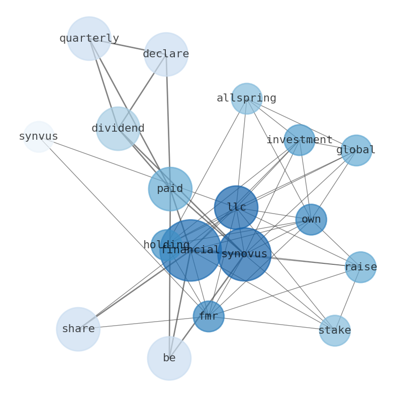 How much time have you spent trying to decide whether investing in Synovus Financial? Many investors start with the dream of being free. They expect to find on the stock market an option to have time to develop their own interests and hobbies. That is, a way to escape a 9 to 5 job. However, investment is complex and investors end up spending whole days (and nights) trying to figure out which the right stock to invest is. The dream of stock investing becomes the nightmare of facing infinity amounts of information. As a solution, we programmed an artificial intelligence that reads the whole internet and the uses natural language processing and vectorizers to summarize the information. Usually, the AI reads several hundred pages and summarize it to a short document. This document presents our results. We found that the most common words in the internet about Synovus Financial are: …